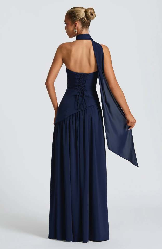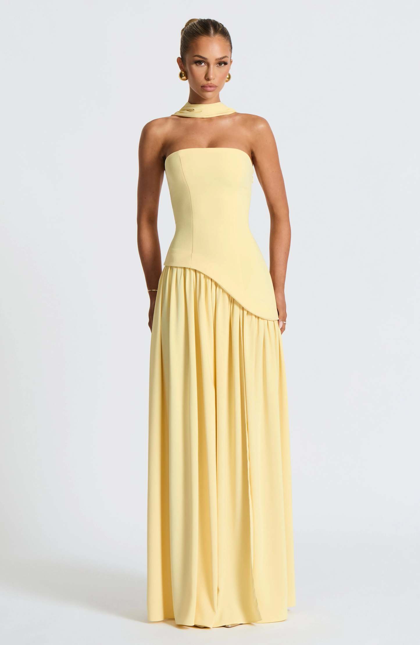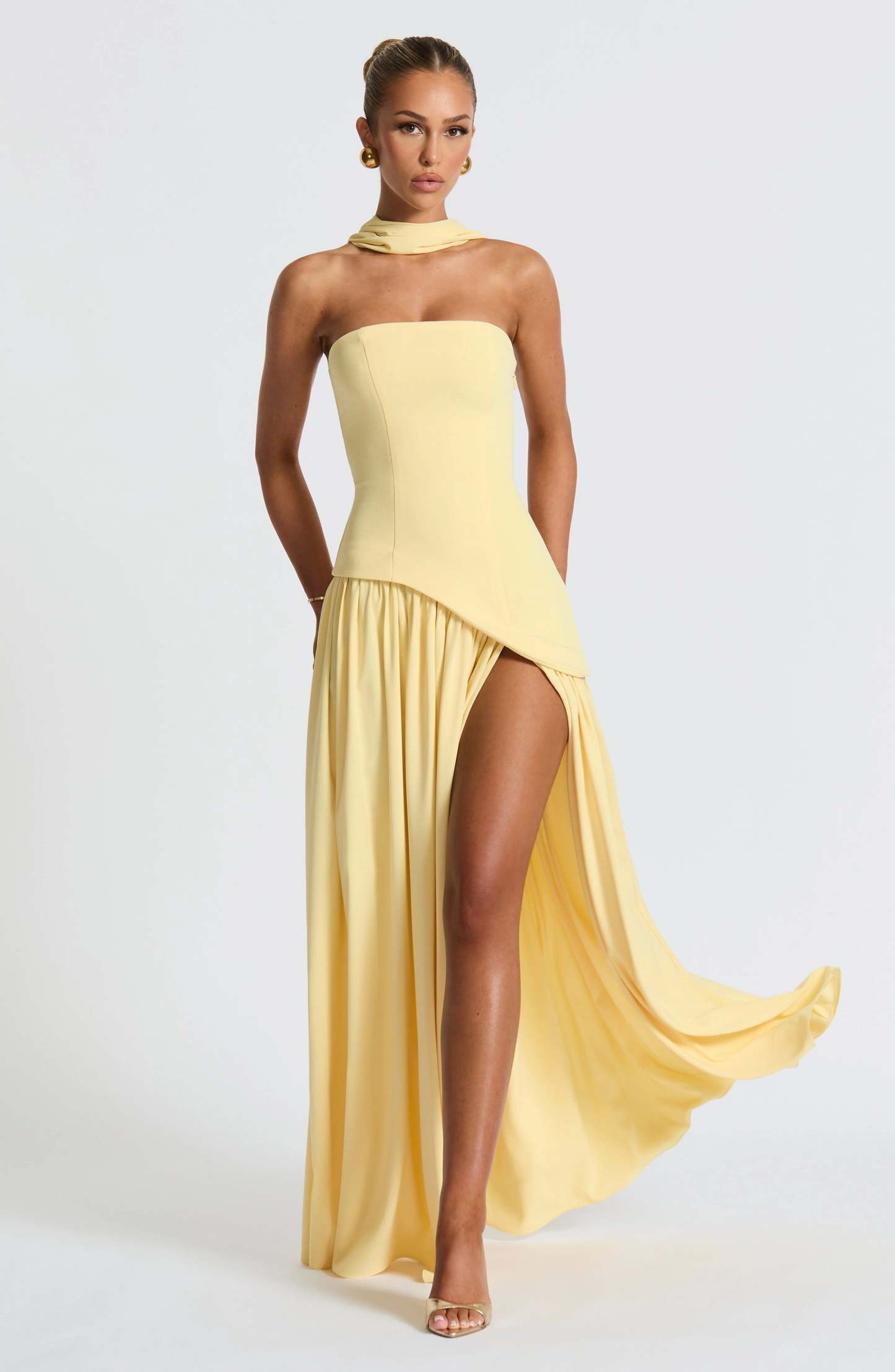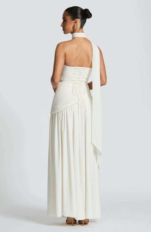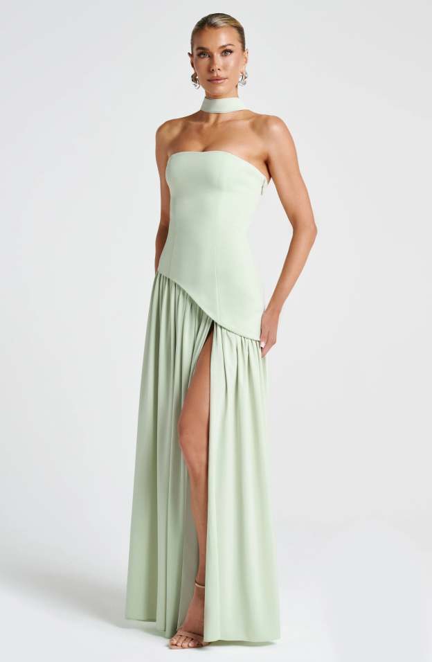 Step into sophistication with the Maia Strapless Maxi Dress, a striking blend of structure and fluidity. Designed with a sculpted strapless bodice featuring an asymmetrical hem, this dress balances bold tailoring with soft, flowing movement. The contrast chiffon skirt drapes effortlessly, creating a graceful silhouette, while a thigh-high split adds just the right touch of allure.
