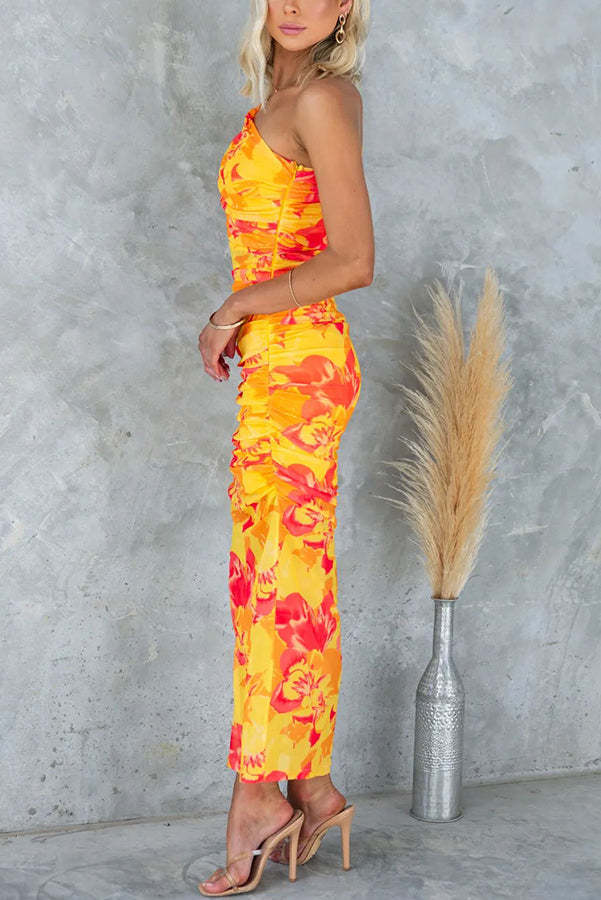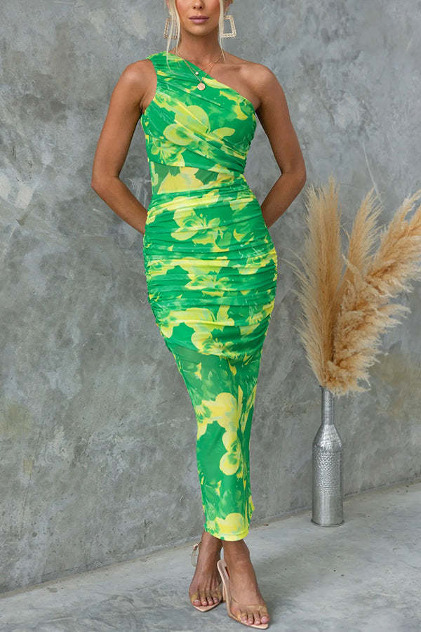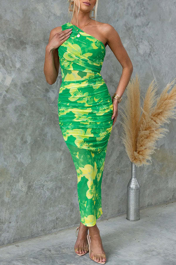 Night Blooms Mesh Overlay Printed One Shoulder Ruched Stretch Maxi Dress