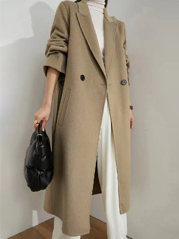 Office Belted Solid Color Notched Collar Wool Overcoat