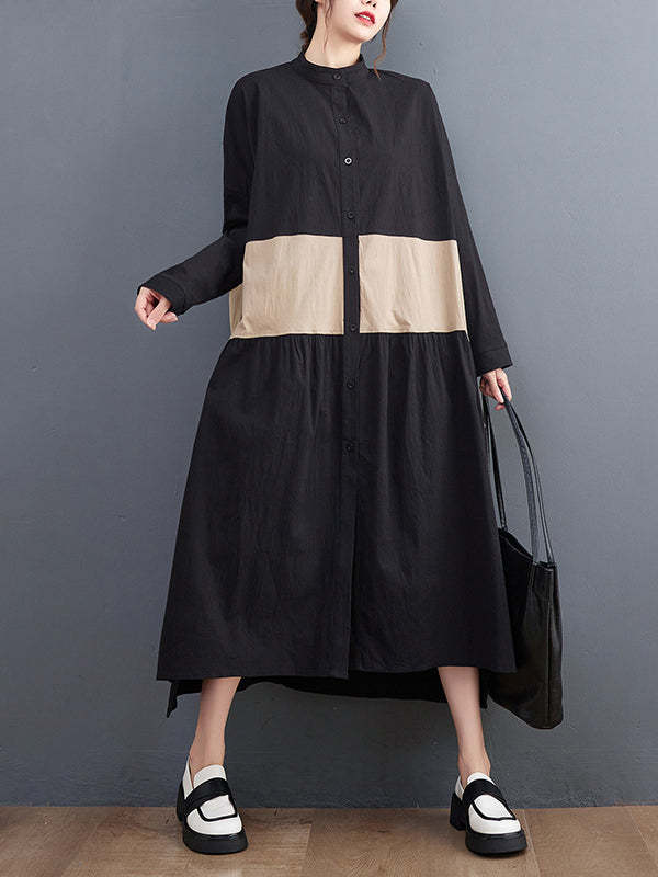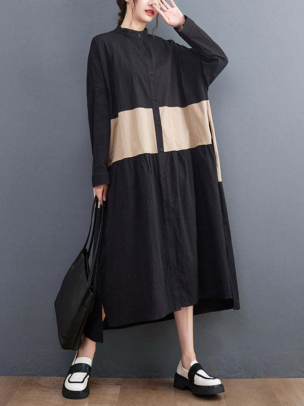 Original Creation Long Sleeves Loose Buttoned Contrast Color Stand Collar Midi Dresses