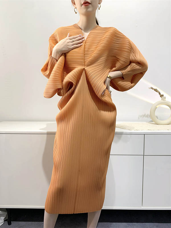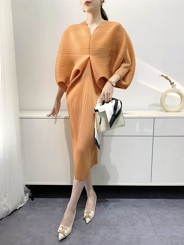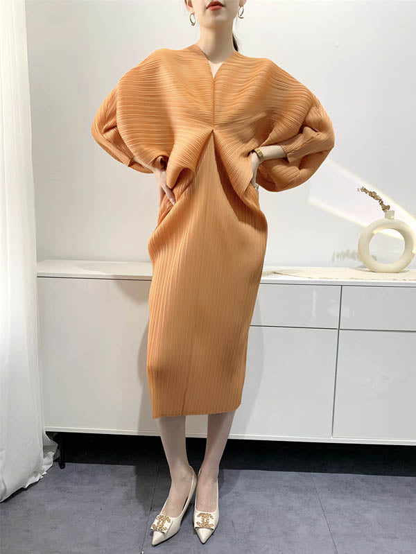 Original Creation Loose Batwing Sleeves Pleated Solid Color V-Neck Midi Dresses
