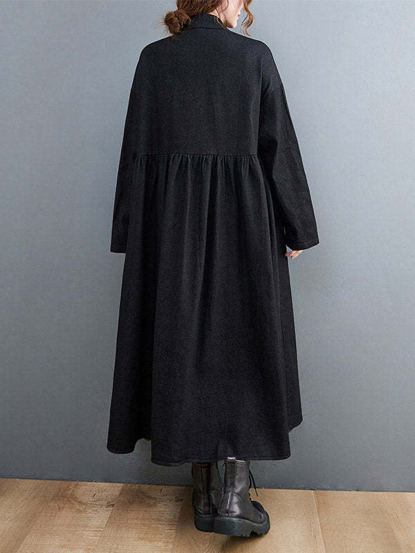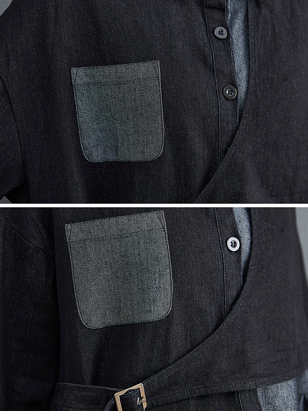 Original Loose Denim Split-Joint Tied Lapel Collar Long Sleeves Midi Dress