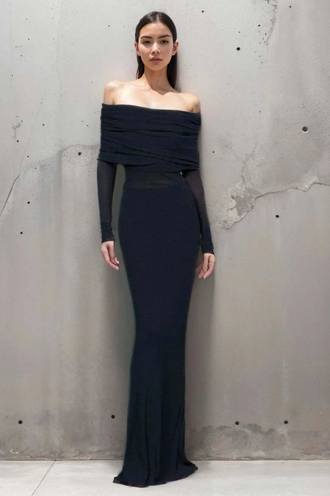 Persia Black Overfold Off-Shoulder Mesh Long Sleeve Maxi Dress