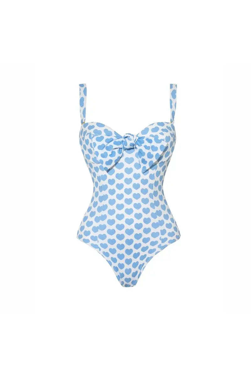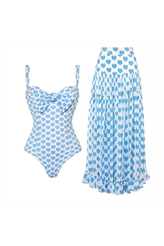 This new European and American style one-piece swimsuit set features a flattering printed design and a flowy skirt overlay, combining elegance with comfort for a chic beach look.