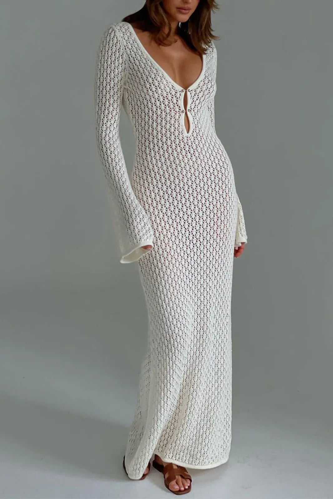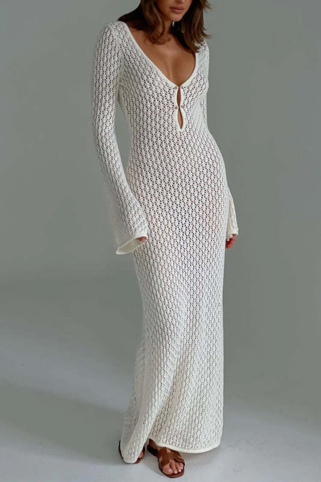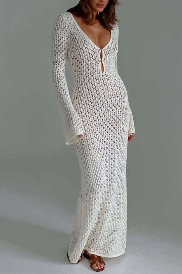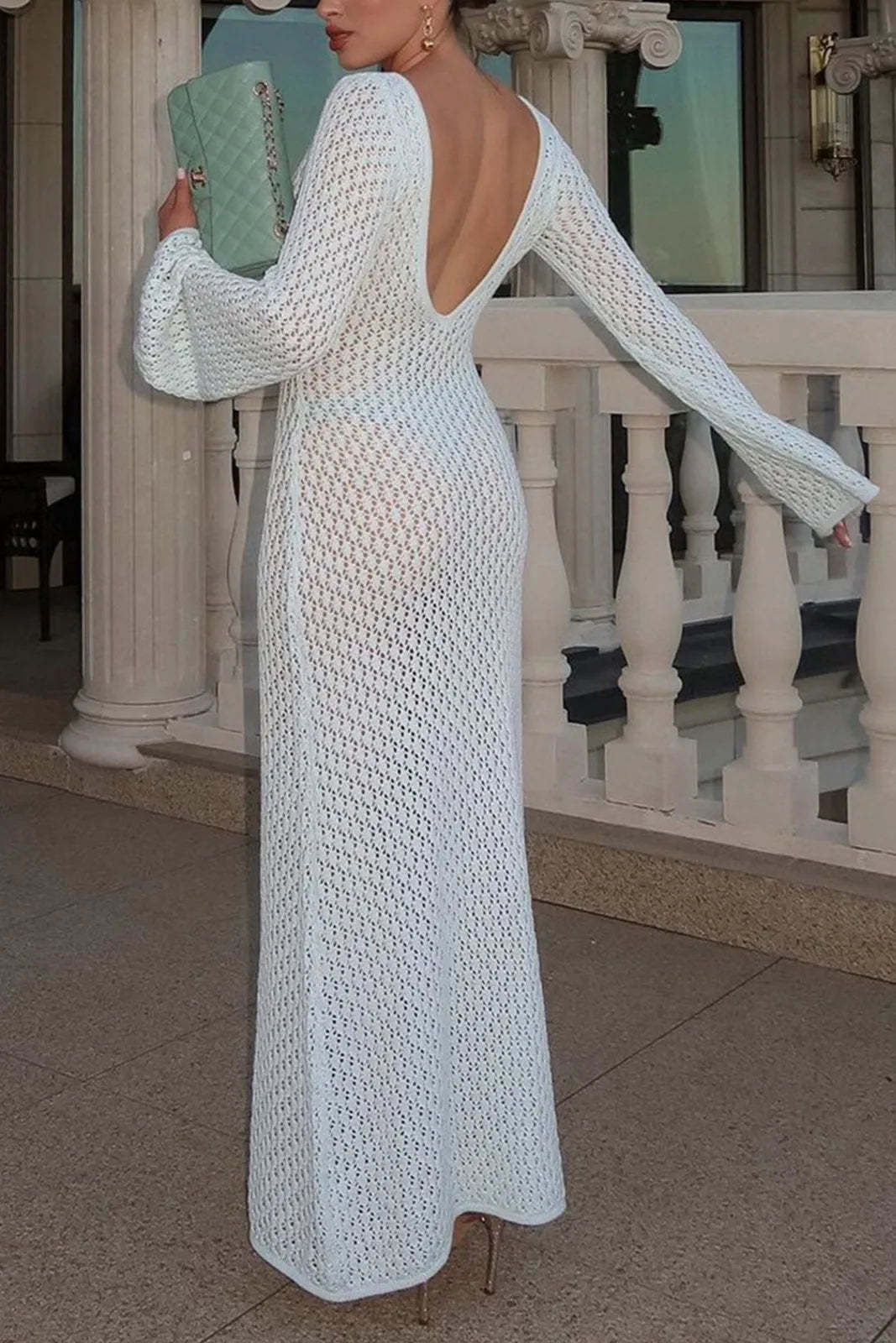 Qearl White Long Sleeve Open Back Maxi Dress