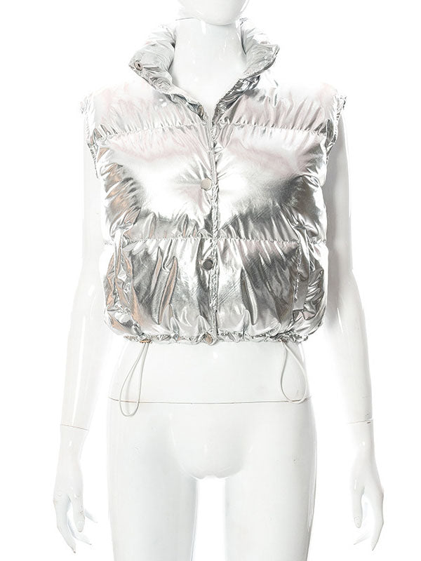 Skinny Sleeveless Drawstring Solid Color Zipper Stand Collar Padded Coat Vest Outerwear
