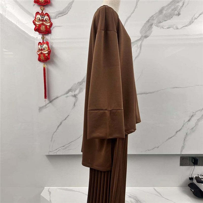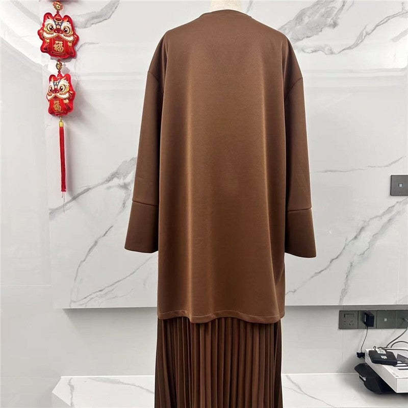 Solid Color Round Neck Long Sleeve Top And Midi Skirt Set