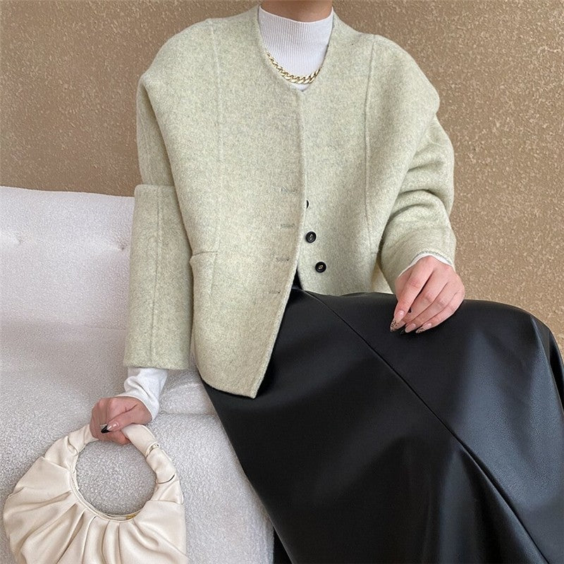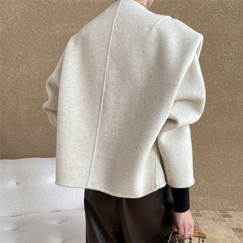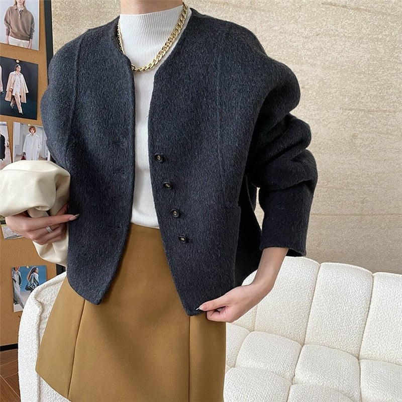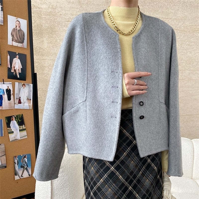 Solid Color Short Round Neck Reversible Woolen Coat