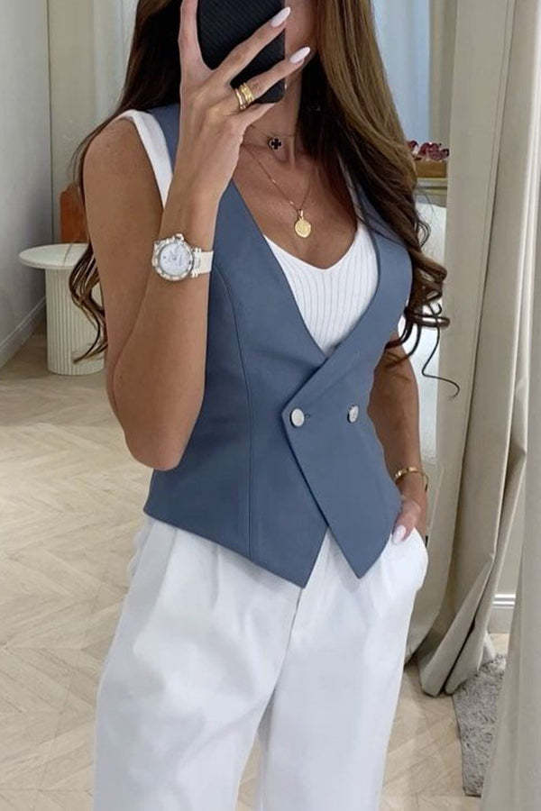 Stylish and Versatile Faux Leather Button Up V-neck Vest Top