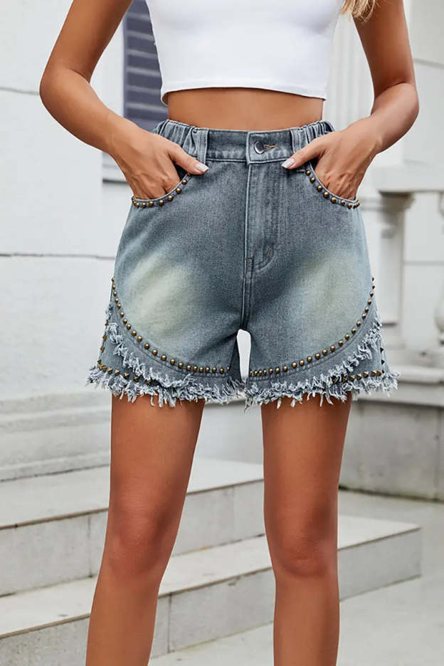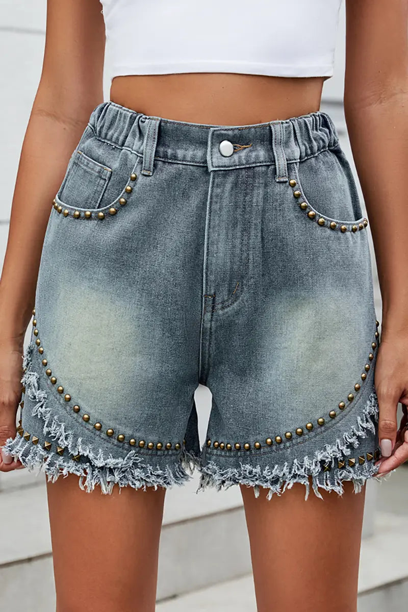 These trendy summer denim shorts feature bold studded detailing and frayed hems for an edgy, street-style look. The comfortable fit and relaxed vibe make them a perfect choice for warm weather outings.