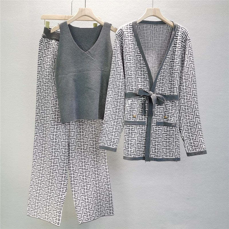 Three-Piece Set Of Printed Sweater, Long Pants, And Vest