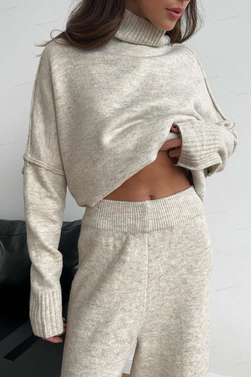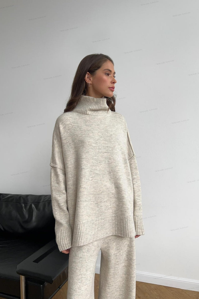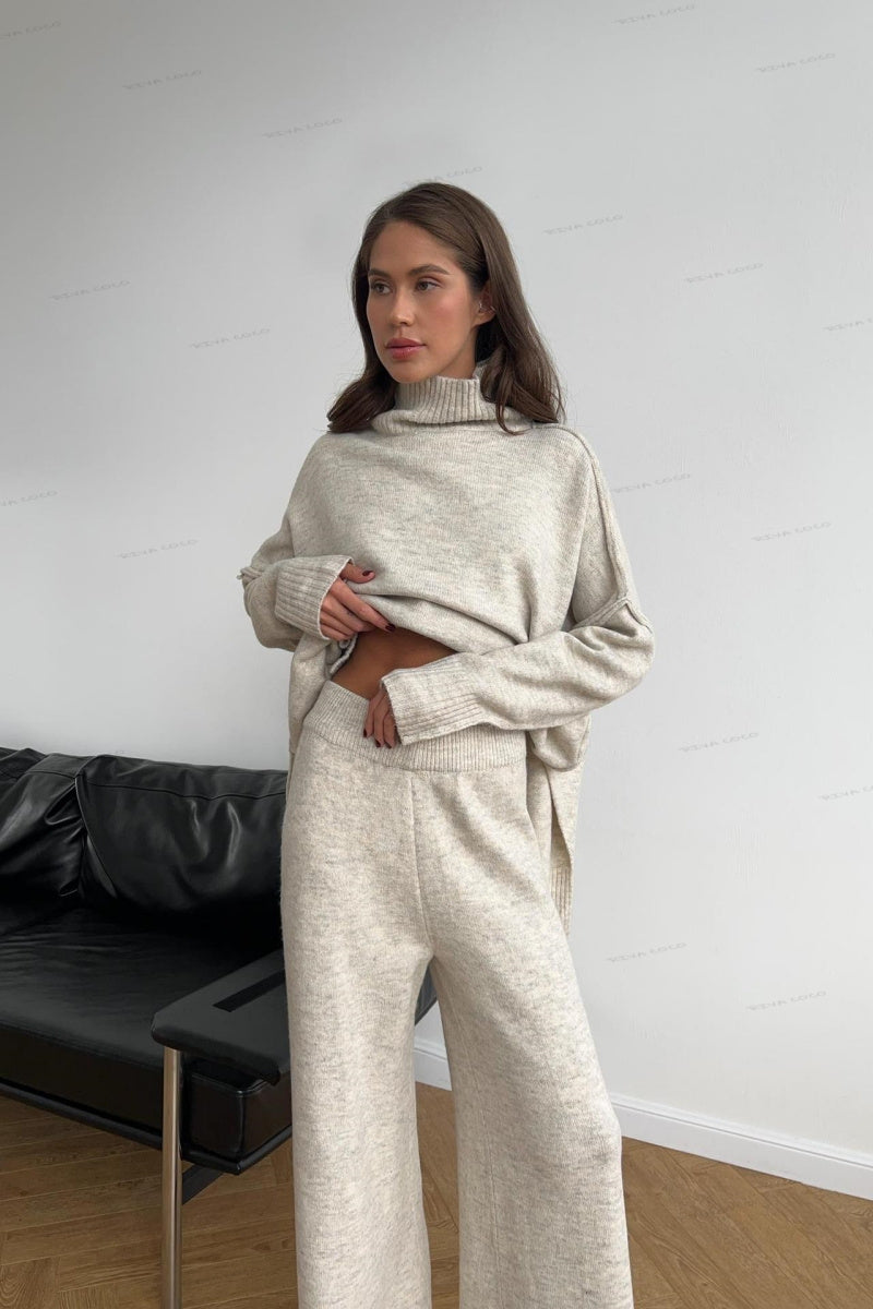 The Turtleneck Split Sweater Loose Knit Pants Set is the ultimate combination of cozy sophistication and relaxed style. Featuring a high-neck sweater with a chic split design and loose-fit, wide-legged knit pants, this set offers a luxurious yet comfortable outfit perfect for lounging or casual outings. The soft, breathable fabric keeps you warm and cozy, while the modern design adds a touch of elegance to your laid-back look.