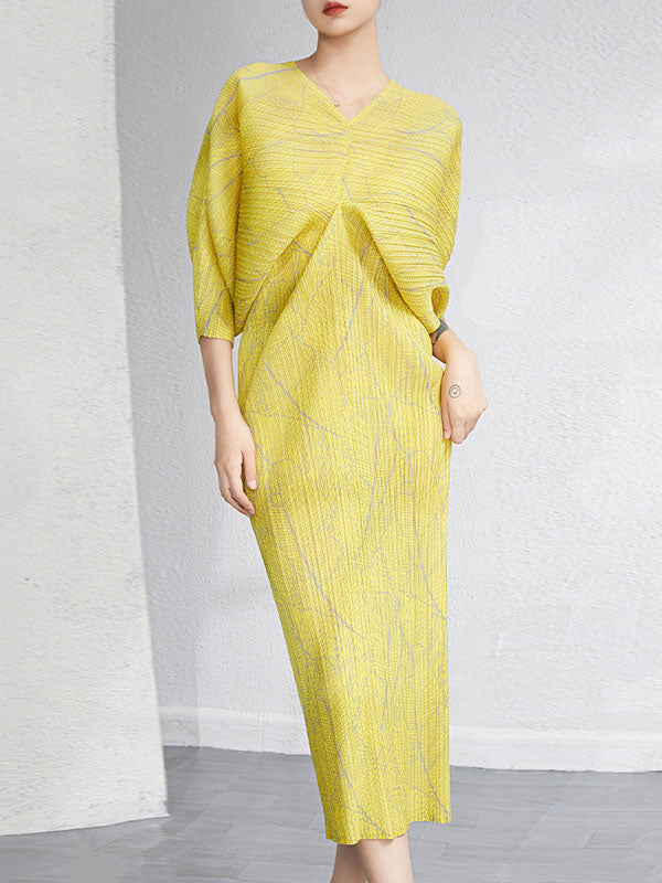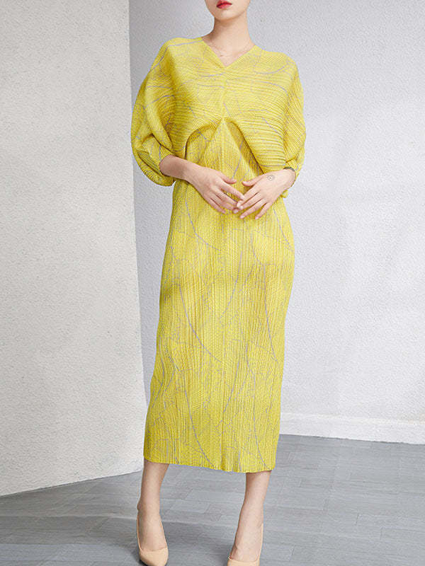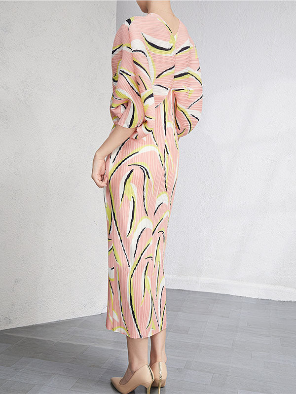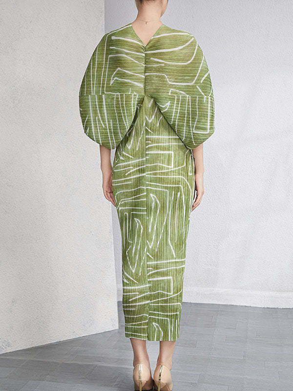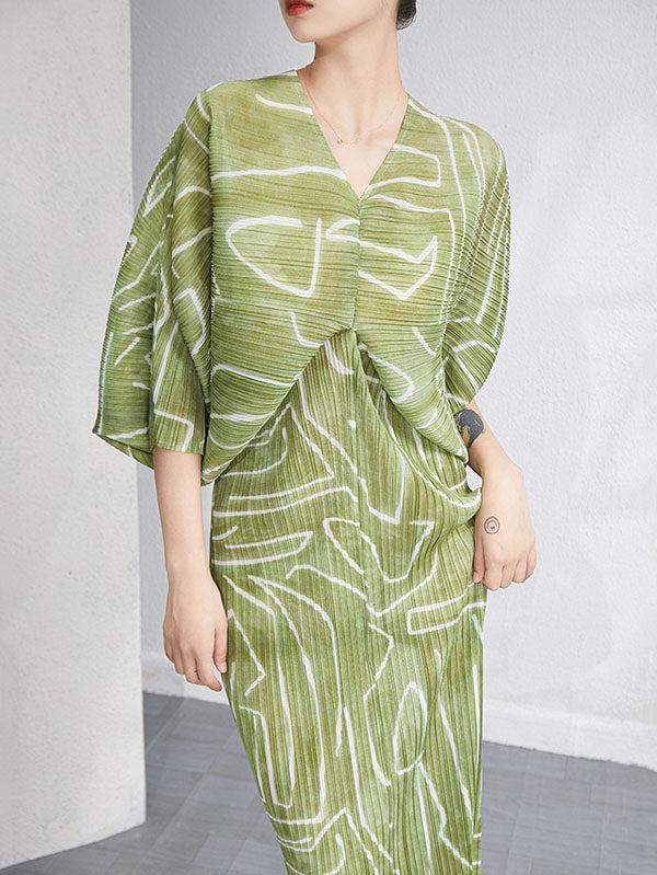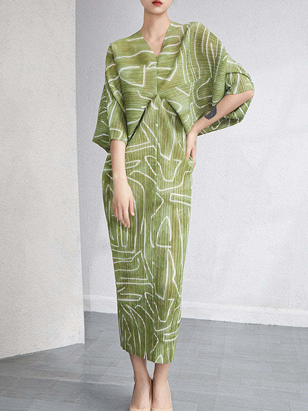 Urban Loose Batwing Sleeves Printed Pleated V-Neck Midi Dresses