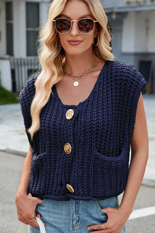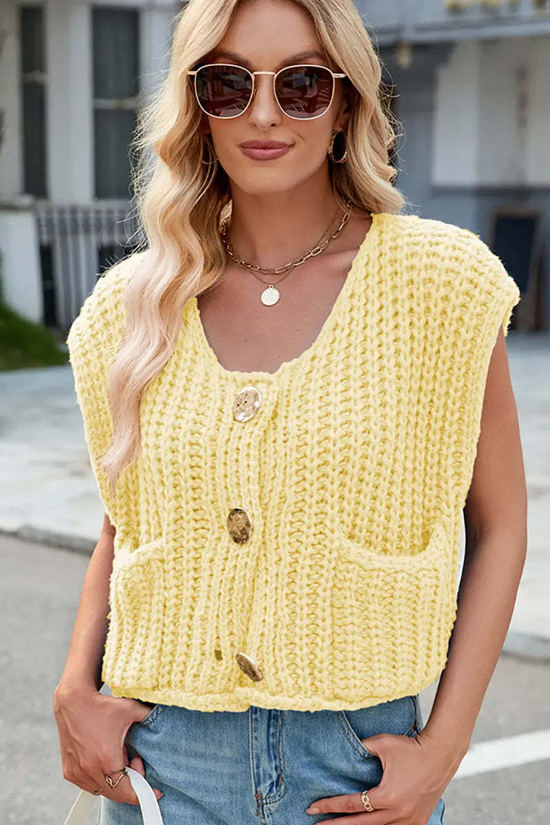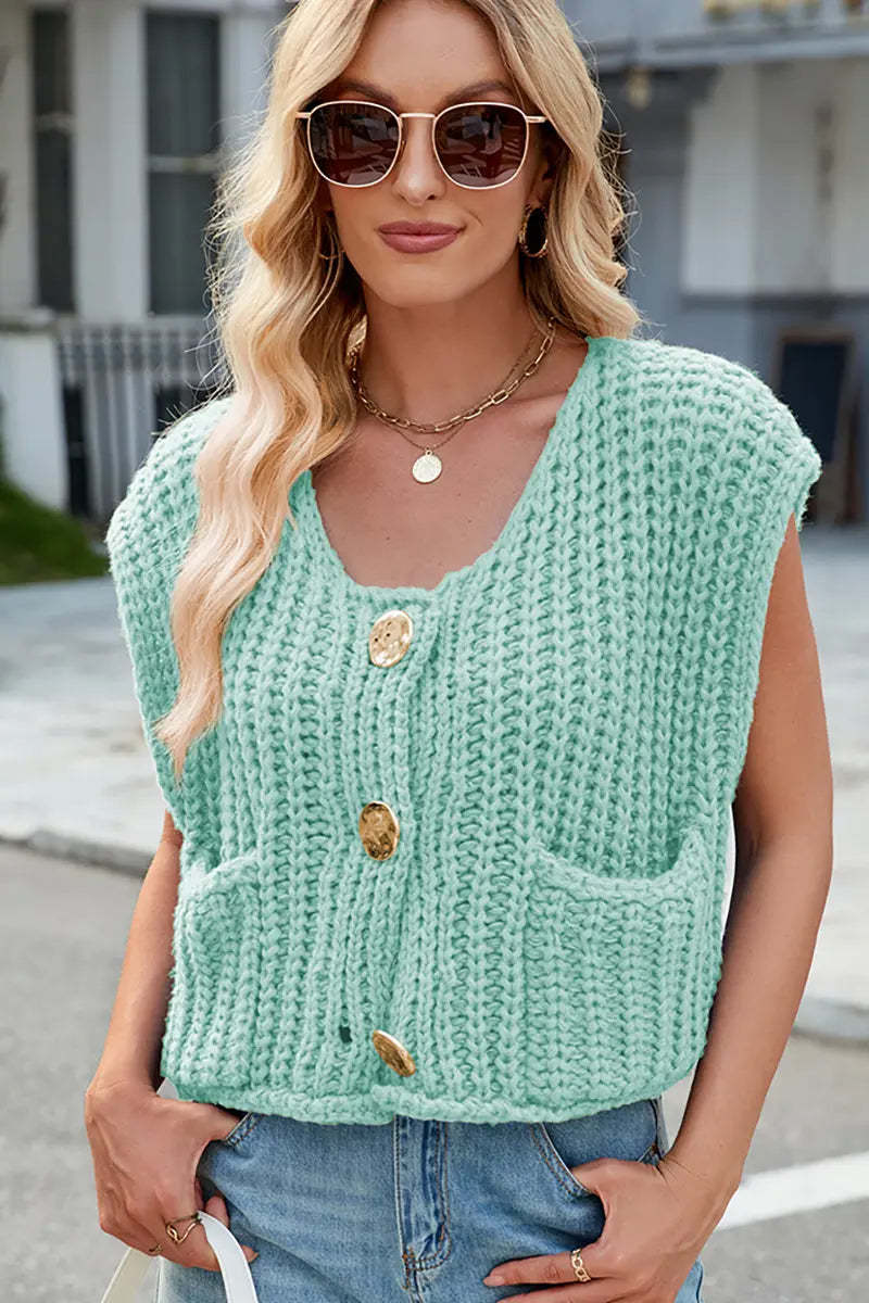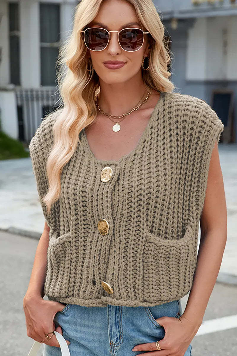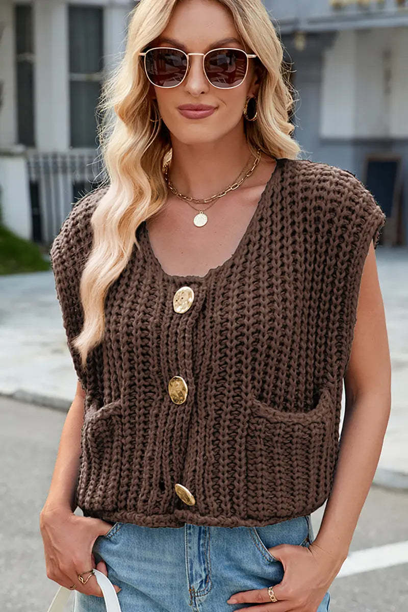 This V-neck sleeveless knit vest features a classic three-button design, making it a versatile and stylish layering piece. Its soft texture and timeless look add elegance and comfort to your wardrobe.