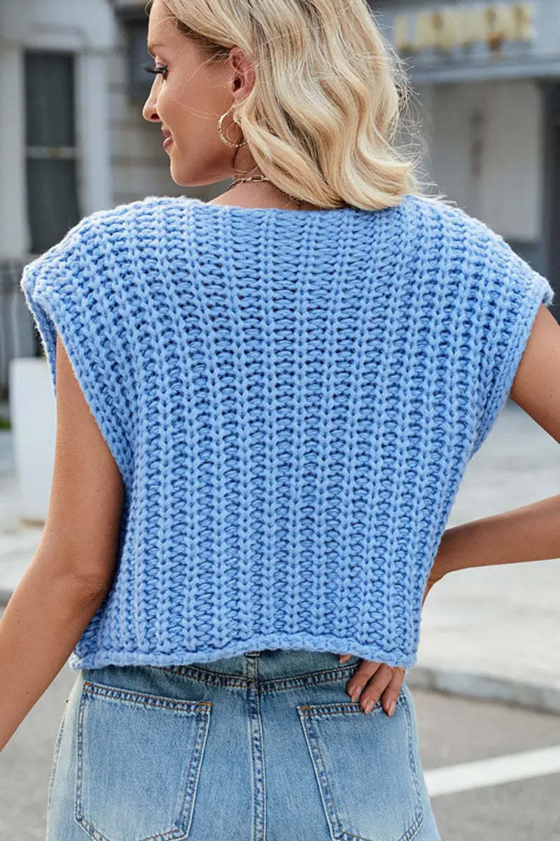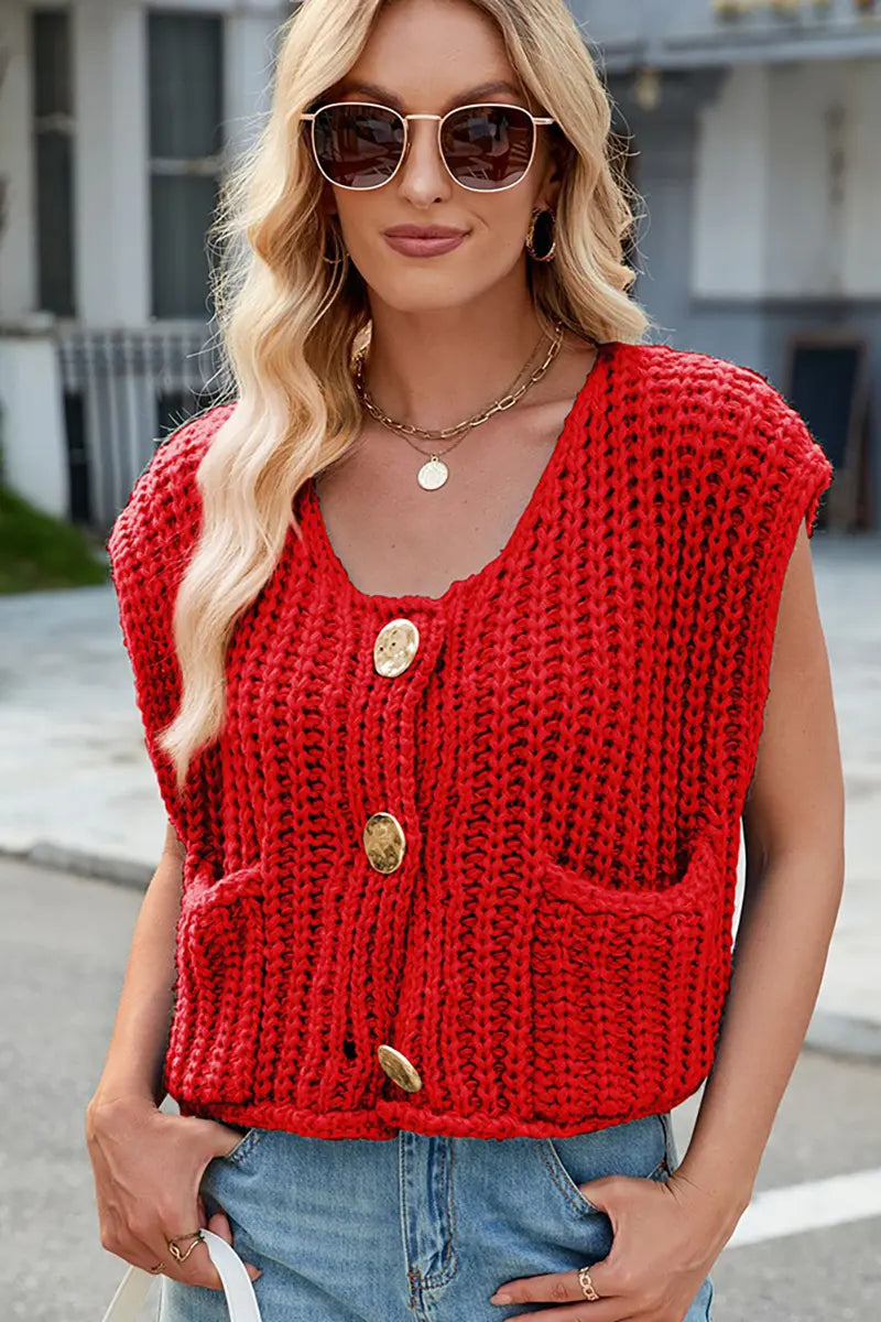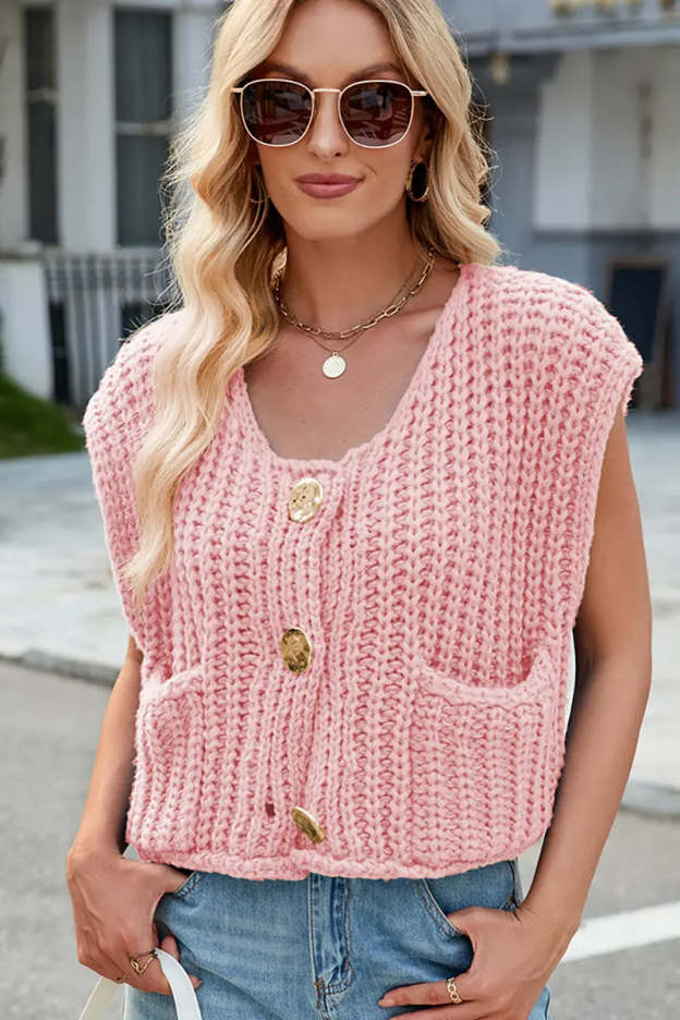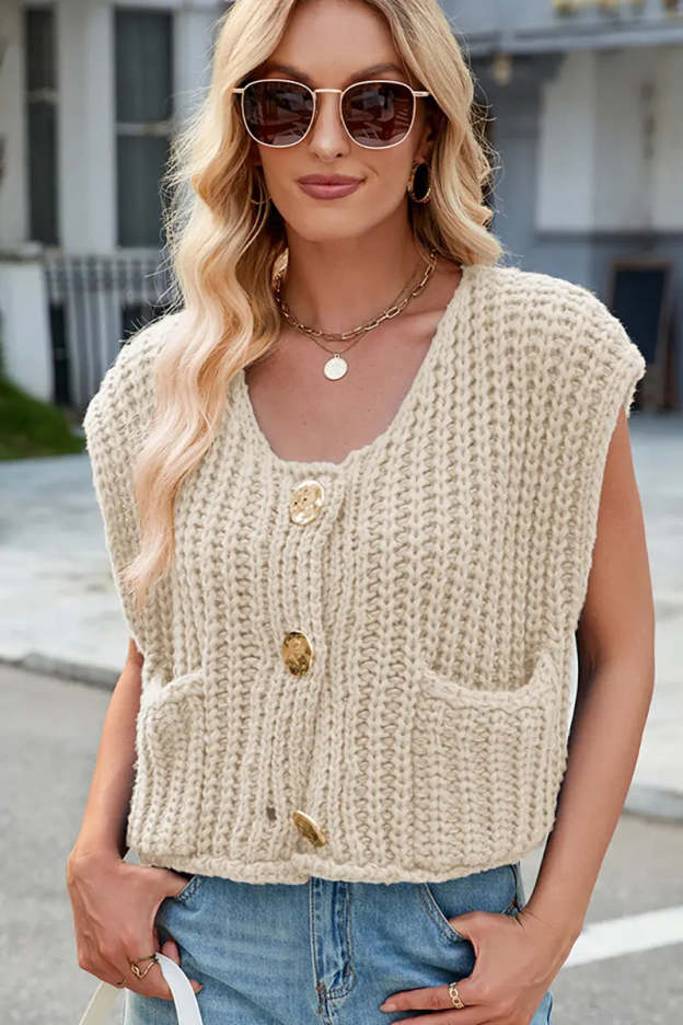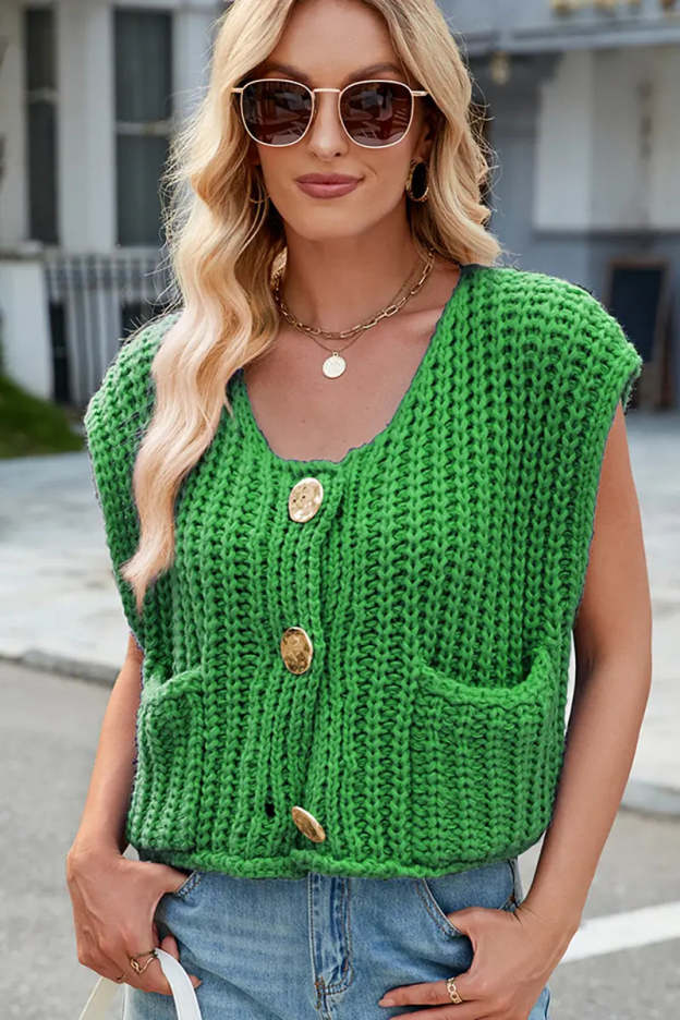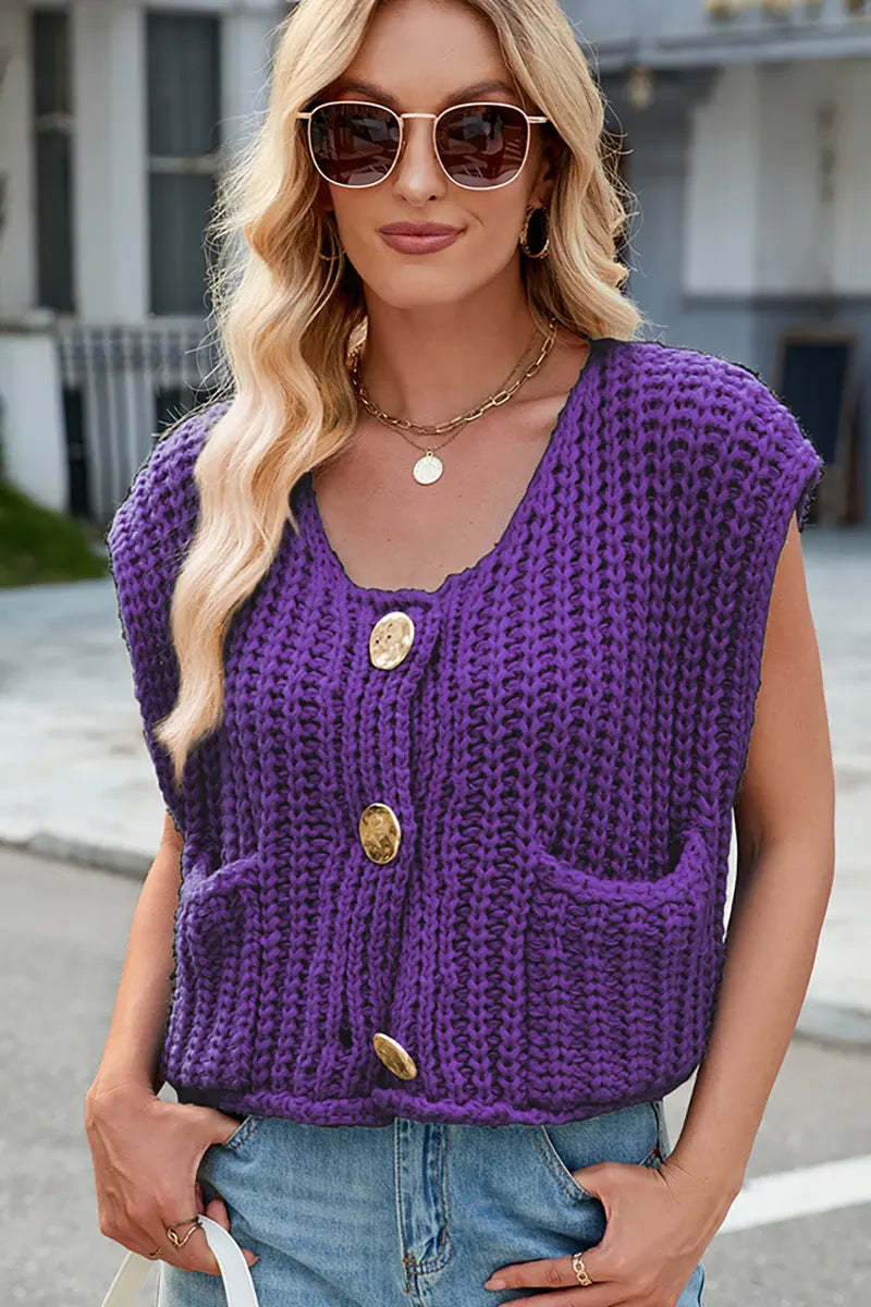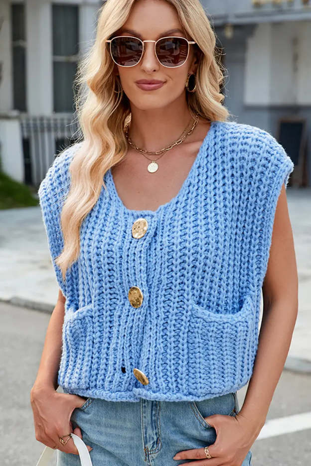 This V-neck sleeveless knit vest features a classic three-button design, making it a versatile and stylish layering piece. Its soft texture and timeless look add elegance and comfort to your wardrobe.