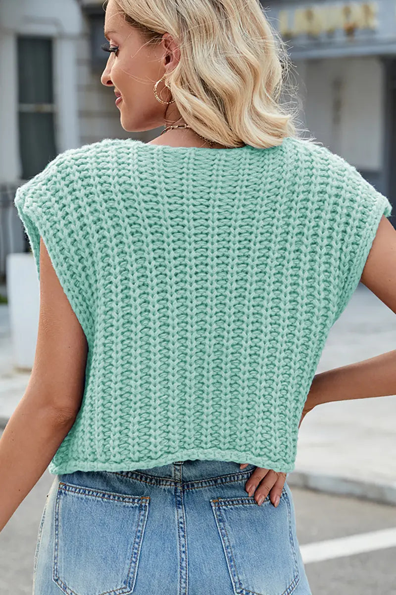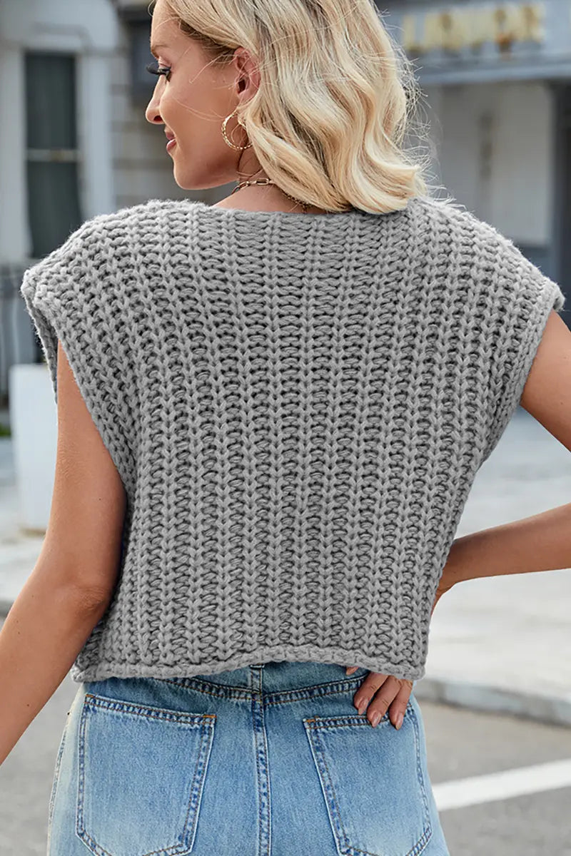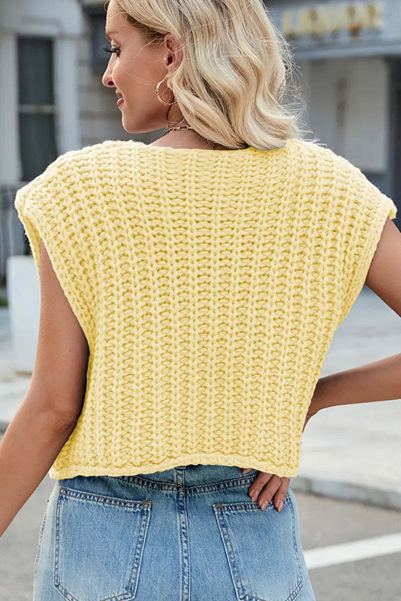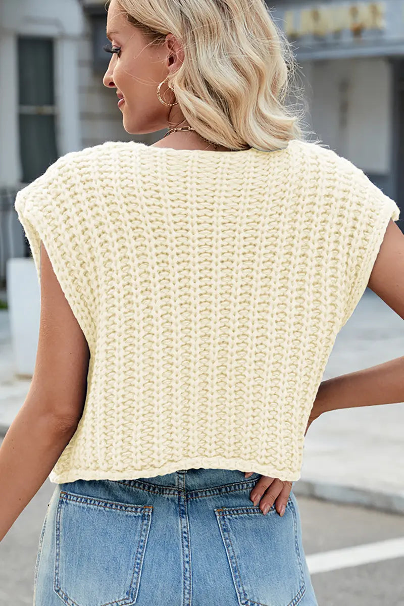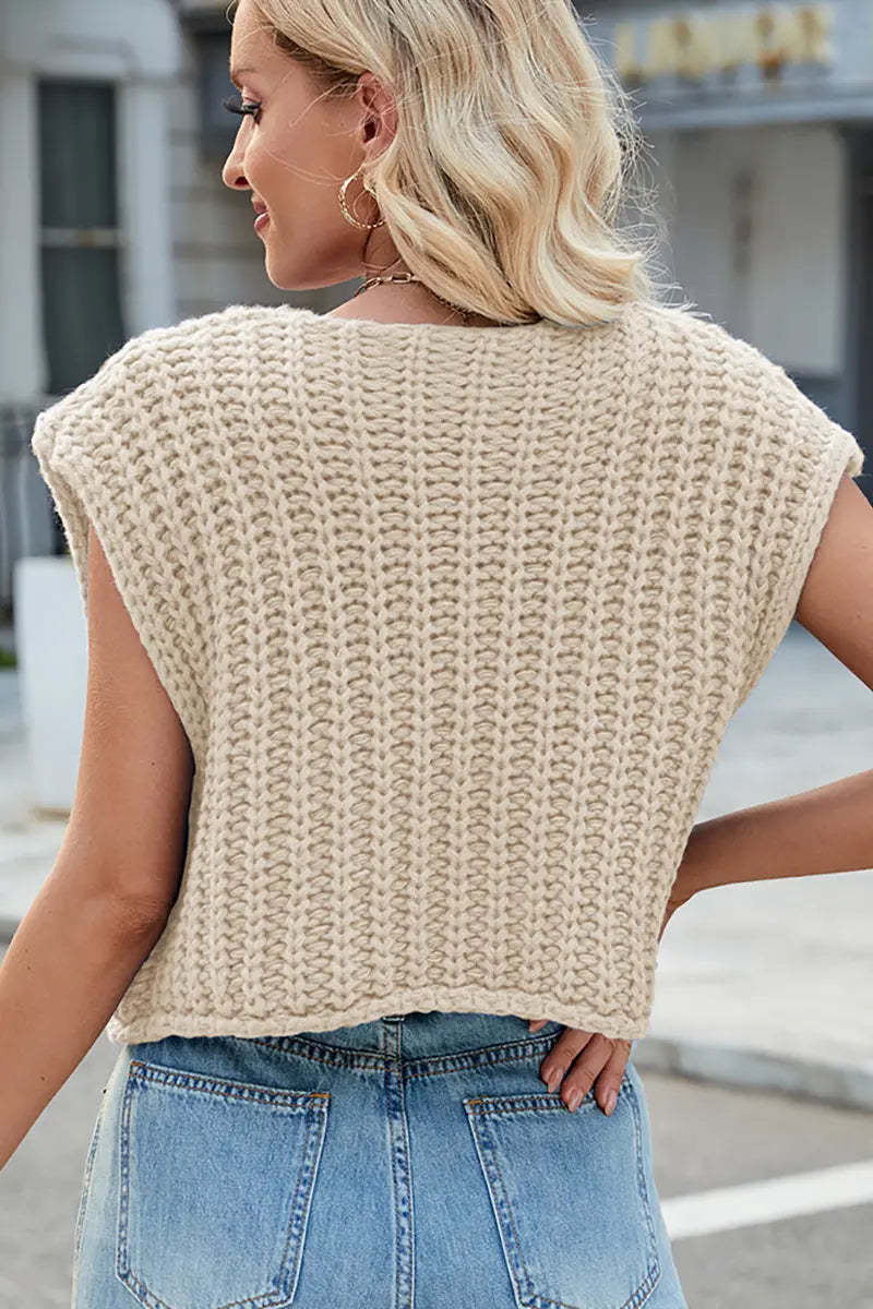 This V-neck sleeveless knit vest features a classic three-button design, making it a versatile and stylish layering piece. Its soft texture and timeless look add elegance and comfort to your wardrobe.
