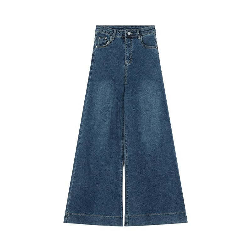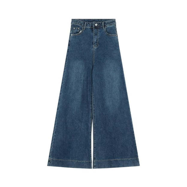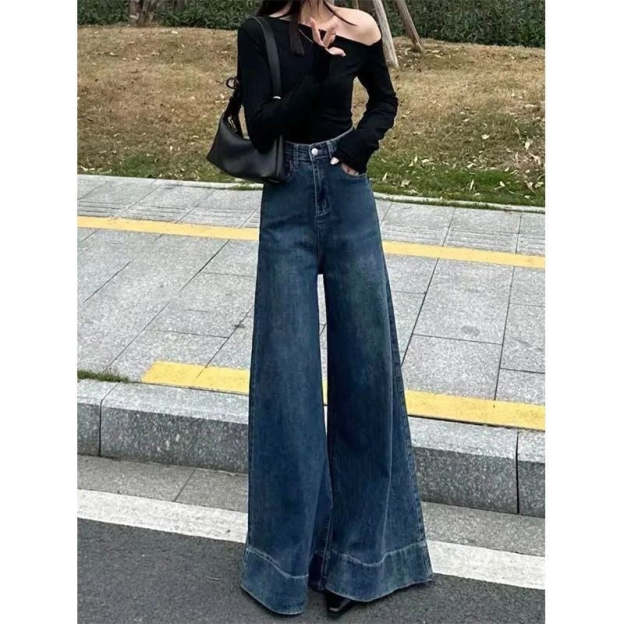 Trendy high-waisted wide-leg denim flare pants with a vintage vibe.