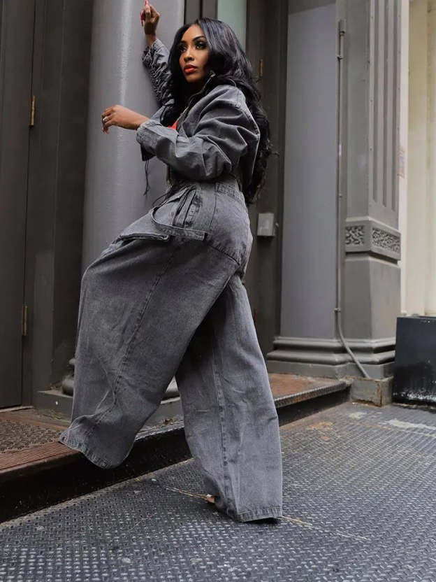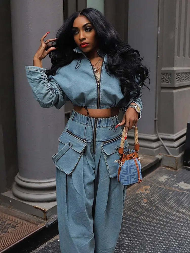 This fashion-forward two-piece set combines retro charm with modern style, featuring wide-leg, relaxed-fit denim pants and a matching top. The heavy-duty denim construction offers durability, while the loose silhouette ensures comfort and movement. Perfect for creating an effortlessly chic look that embraces both comfort and style.