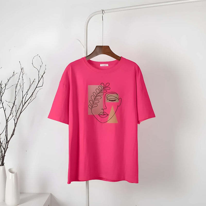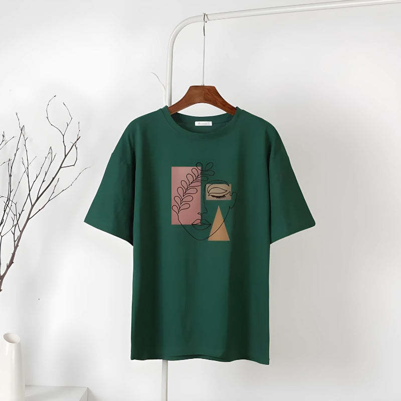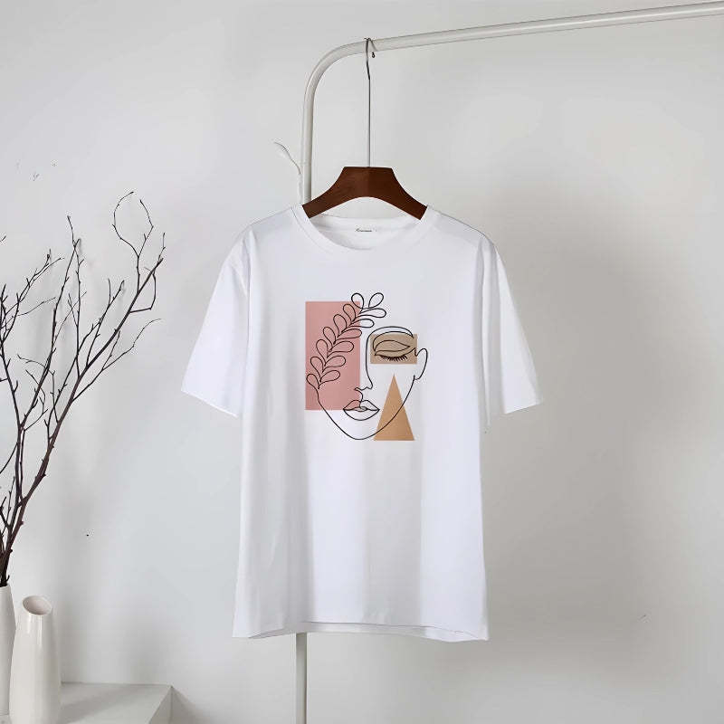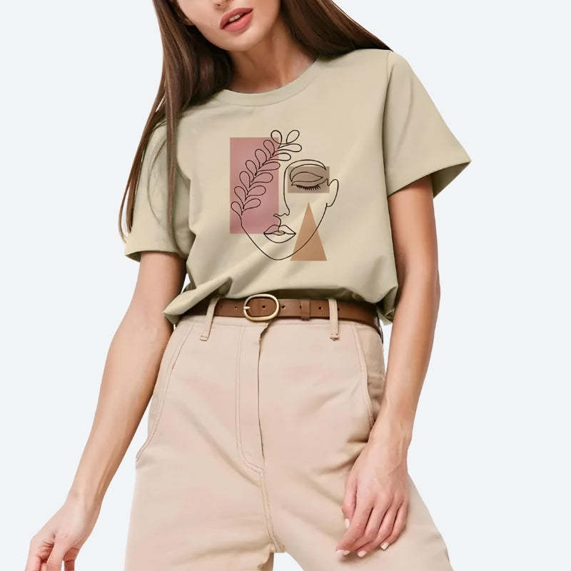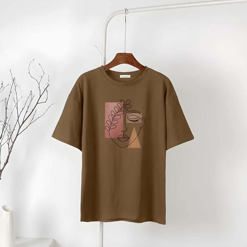 Wrap yourself in this artistic tee that's a celebration of minimalist design. Ideal for those who find beauty in simplicity, this top pairs effortlessly with your favorite denim for a chic, understated look. Channel a serene vibe with its earthy tones and abstract line art that speaks volumes without saying a word. Perfect for a casual day out or an evening of introspection.